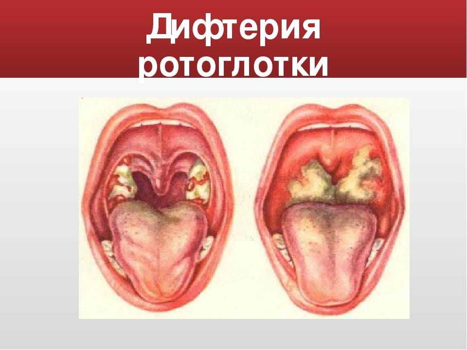 Дифтерия. При дифтерии зева в горле образуются налёты, по виду очень похожие на таковые при ангине.