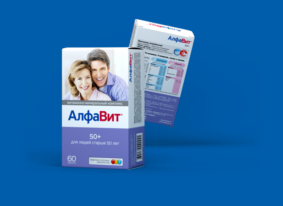 Алфавит 50+ — универсальный препарат для людей старше 50. Обогащен каротиноидами, лютеином, ликопином. Предназначен для поддержания хорошей работы опорно-двигательного аппарата, зрения, сердца, нервной системы (включая головной мозг), для замедления процессов старения всего организма, для корректировки уже случившихся возрастных изменений. Также выступает как профилактическое средство от остеопороза, остеоартроза, сердечно-сосудистых заболеваний. Витаминов 13, минералов 9.