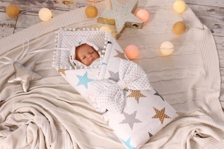 Размер одеяла должен быть таким, чтобы малыша можно было в него полностью завернуть.